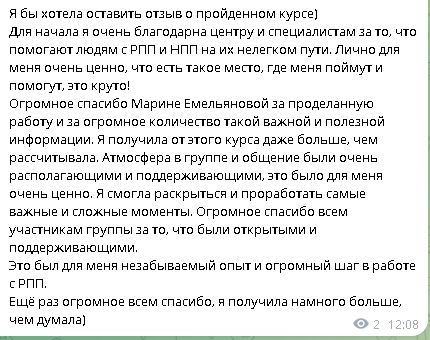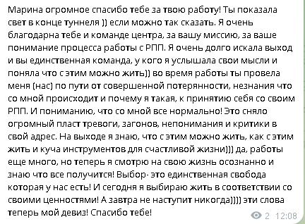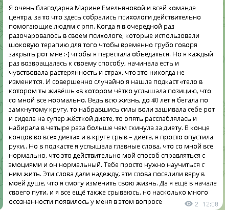 Участники перестают жить в жестких рамках «срыв - диета - срыв - чувство вины». Они начинают понимать, что работа с РПП - это не про то, чтобы «зашить рот» и временно похудеть, а про бережное отношение к себе. Это приносит огромное облегчение: «оказывается, со мной всё нормально, и с этим можно жить».